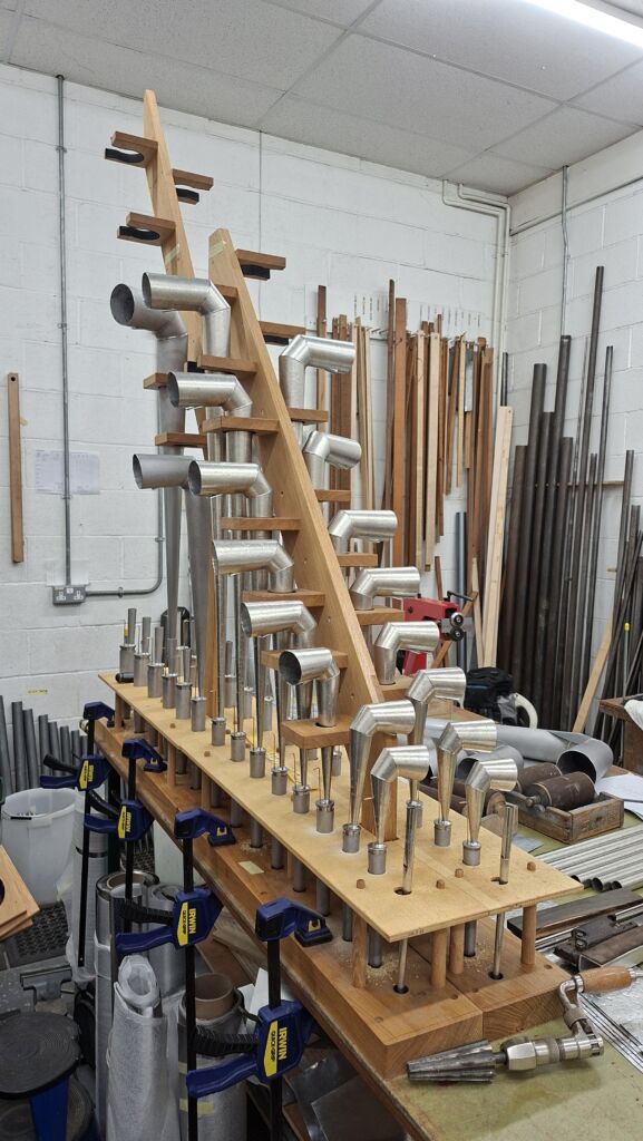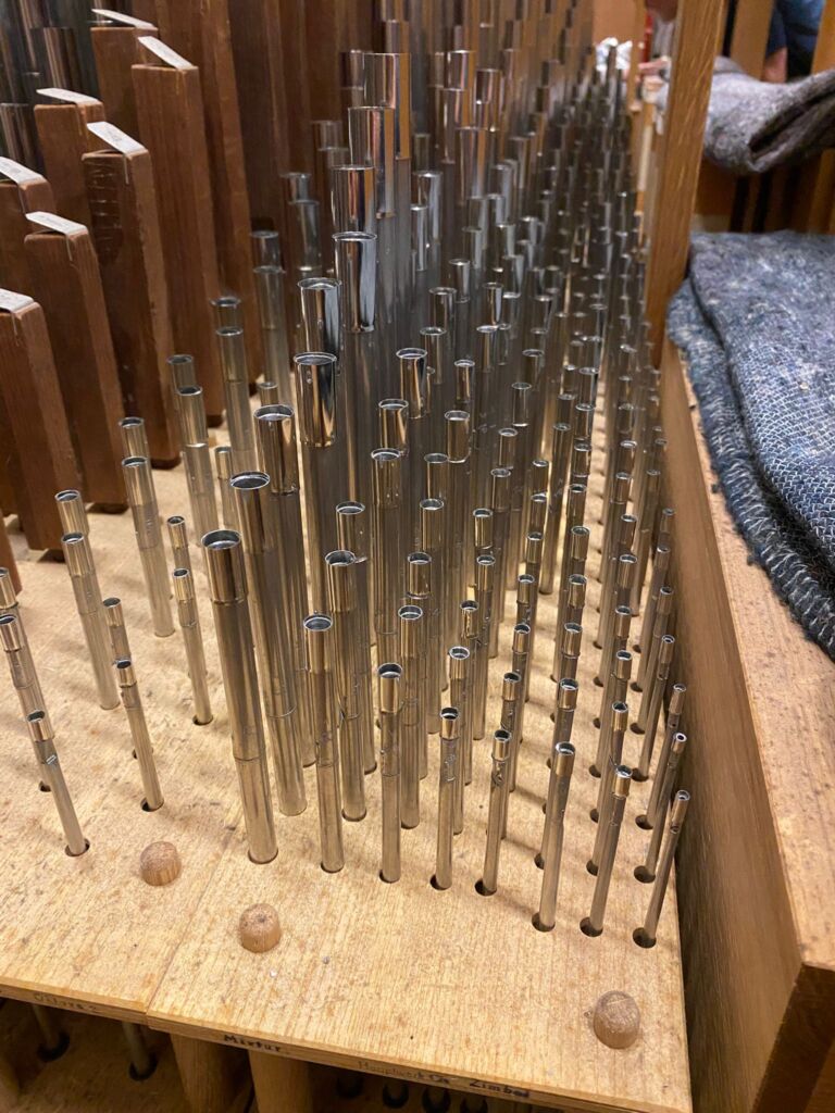 – Trompette Harmonique 8′ and Clairon 4′ repaired and revoiced with new shallots and tongues to give them a broader, more blending tone.