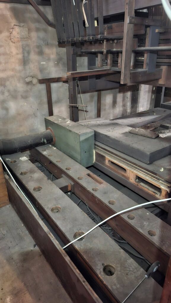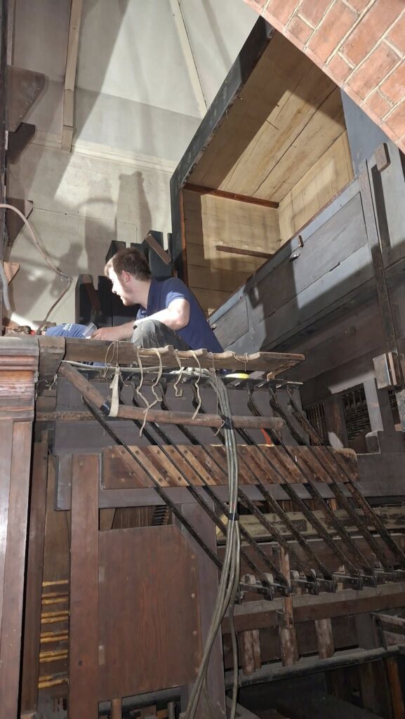 The organ has mechanical action throughout, except for charge pneumatic to the pedal division. The instrument is being restored without alteration.