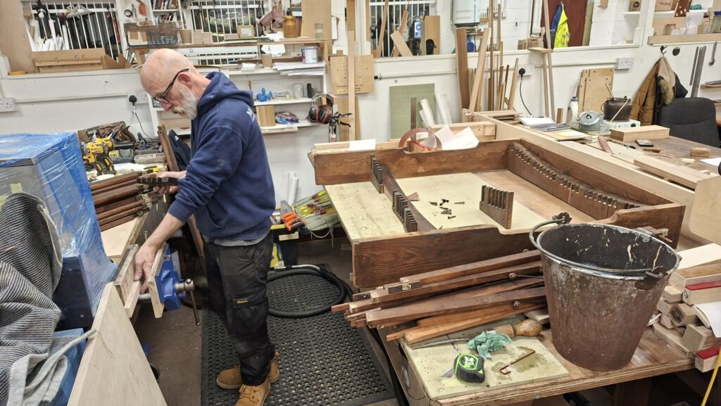 While they always remained a provincial firm, Nicholson & Lord flourished. Most of their work was building small but well-built instruments around the Midlands. The firm’s magnum opus was the four-manual organ for Walsall Town Hall, completed in 1908. A few years ago, we restored one of their smaller instruments, built in 1895 for All Saints’ Church in Dilhorne, Staffordshire.